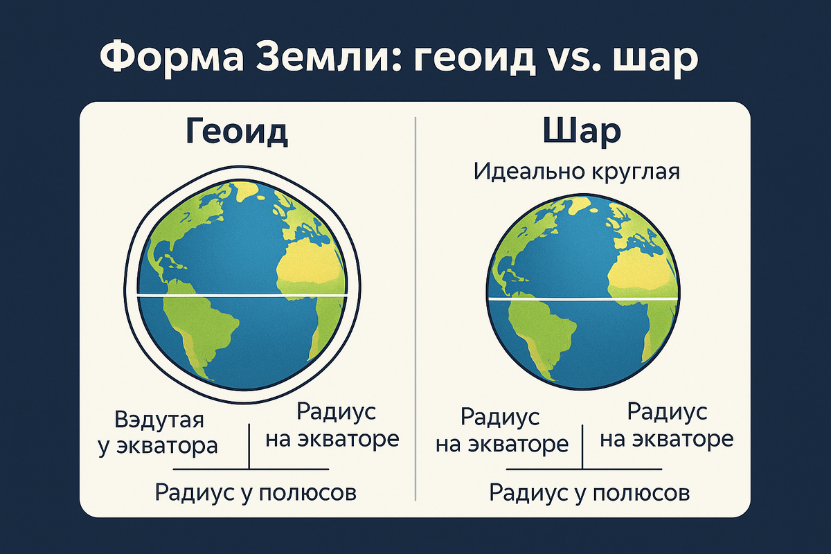 Для сравнения: если бы Земля была размером с футбольный мяч, её экватор был бы чуть-чуть «вздут» на миллиметры — почти незаметно. Но в масштабах планеты это значит, что на экваторе ты дальше от центра Земли, чем на Северном полюсе.
