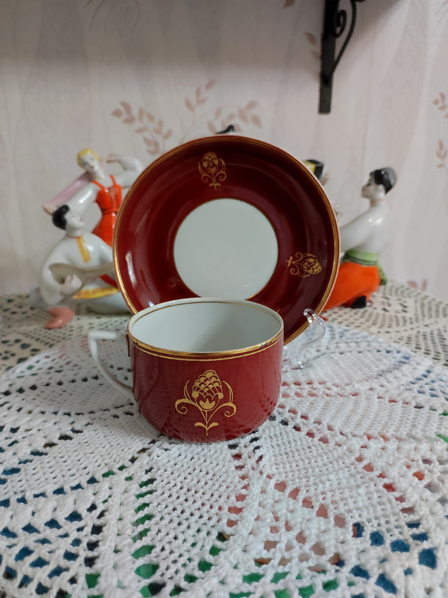 Доброго времени суток, мои дорогие подписчики !!! Сегодня последний день июня, очень как-то быстро и неожиданно закончился первый месяц лета, хотя как такового его ещё и не было, у нас все выходные снова дожди. Ну да ладно, у природы ведь нет плохой погоды) А у меня ещё не все июньские приобретения вам показаны. Недавно мне моя подписчица предложила за совсем символические деньги вот такую чайную пару. Авито почтой была очень дорогая доставка и мне её в Тверь заказала Оля (младшая дочка) другой доставкой. А потом привезла во Ржев, когда мы ездили к Алёне (об этом я писала в прошлых статьях). Это чайная пара от сервиза "Золотой ананас" Дмитровского ФЗ, сервиз редкий, конца 40-х годов прошлого столетия. Очень тонкий фарфор, крытьё терракотового цвета, на крытье золотом нанесён рисунок "золотой ананас" и отводка золотом. Блюдце в идеальном состоянии. На чашечке небольшая трещинка. Но я очень рада, что она будет жить в моей коллекции. Очень хотела узнать историю создания этого сервиза, ав