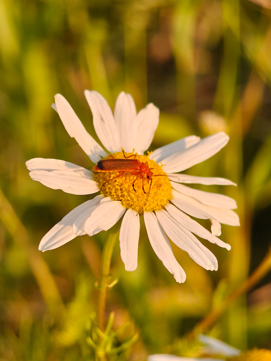 Сегодня перед заходом солнца, в золотой час, я сфотографировал полевые ромашки. Свет в это время был просто волшебным — мягкий и тёплый, он придал фотографиям особую атмосферу. Думаю, получились неплохие снимки.