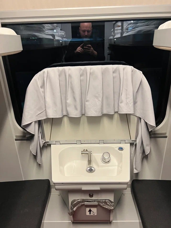 Каково же было мое удивление, когда я зашел в купе и увидел это. Но обо всем по порядку. Недавно я летал в Пермь, а вылет туда был из Моквы. В этот раз в качестве способа передвижения я выбрал ночной поезд. Признаюсь честно, в последнее время я обычно беру дневные поезда или самолёты, но тут время было удачное, да ещё и билет урвал на распродаже баллов РЖД-бонус за 50% от обычной стоимости, доплатил лишь за белье и завтрак. Но это лирика, теперь к сути. Захожу я в свое купе, сажусь, заглядываю под столешницу, а там вместо привычной открывашки на тонкой железной ножке с ободранной краской - непривычного вида конструкция. Пытаясь понять, что же это, я интуитивно поднимаю столешницу и вижу вот это. "ПИСУАР!", - это моя первая мысль. Нет, серьезно, ёмкость напоминала писуар прямо в купе, только вытянутую не вверх, а вширь. Но потом я присмотрелся и понял - это маленькая раковина и умывальник. Методом научного тыка я даже сделал так, что вода полилась! Но я очень надеюсь, что никто, кроме м