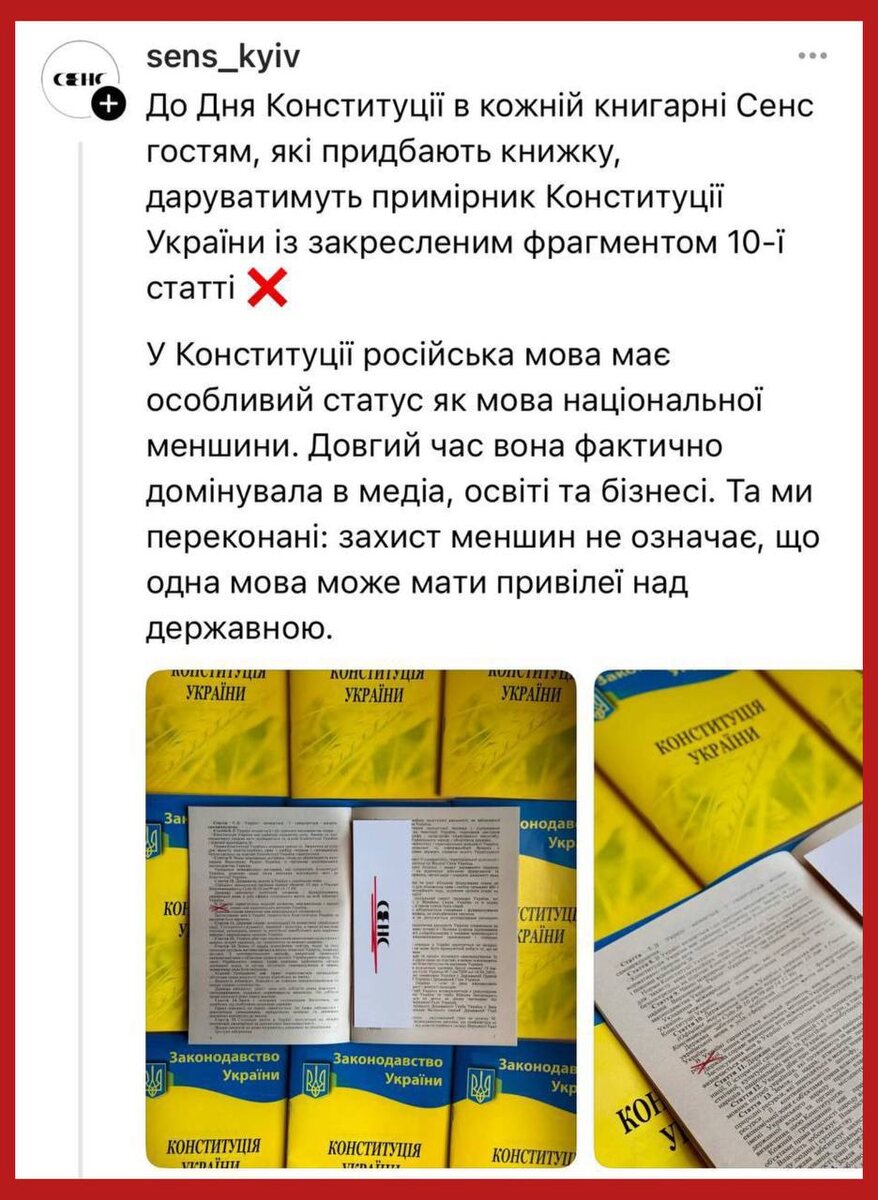 Киевская сеть книжных магазинов Сенс дарит посетителям Конституцию с зачеркнутым фрагментом 10-й статьи, в которой говорится о гарантиях защиты русского языка. Об этом магазин сообщил на своей странице в соцсетях.