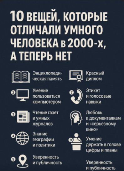 Сейчас: Всё в телефоне. Ум — это не “знать”, а “уметь быстро найти и применить”. Парадокс: Сегодня человек с гуглом в кармане кажется умнее, чем тот, кто учил “Бородино” наизусть. Тогда: Тот, кто знал Excel, мог переустановить Windows и объяснить, что такое торрент, — был королём офиса и спасителем всей семьи.