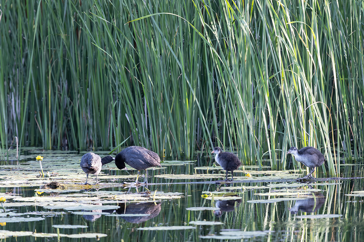 На реке держится семейство лысух с уже подросшими лысушатами. Лысухи-родители несмотря на то, что детки уже подросли, тщательно за ними бдят и при приближении малейшей опасности один из родителей уводить малышню в заросли камыша. Деревенские ласточки устроили гнездо на веранде лаборатории и насиживают кладку. На гнезде сидят птицы попеременно. При этом я заметила, что одна ласточка (уж не знаю самец или самка) к нашему появлению на веранде относилась