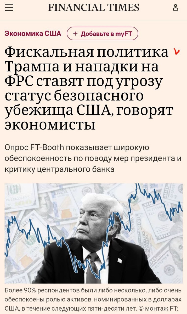 ⚡️Более 90% респондентов были либо немного, либо очень обеспокоены ролью активов, номинированных в долларах США, в течение следующих 5-10 лет. Фискальная политика Трампа и нападки на ФРС ставят под угрозу статус безопасного убежища США, говорят экономисты. Белый дом настаивал на этой неделе, что экономическая политика Трампа поможет сократить долг США, поскольку он сделал последний шаг к победе над фискальными ястребами в Сенате и вывел за черту флагманский налоговый законопроект президента. Независимые оценки указывают на меры, содержащиеся в бюджет Законопроект, который сам Трамп окрестил "большим красивым законопроектом", позволющим преодолеть федеральный долг США после окончания Второй мировой войны в конце этого десятилетия. В то время как традиционно доллар растёт во время приступов паники на мировом рынке, в этот раз резкая распродажа на мировых фондовых рынках после обнародования Трампом агрессивных взаимных импортных тарифов 2 апреля сопровождалась наоборот обесцениванием ам