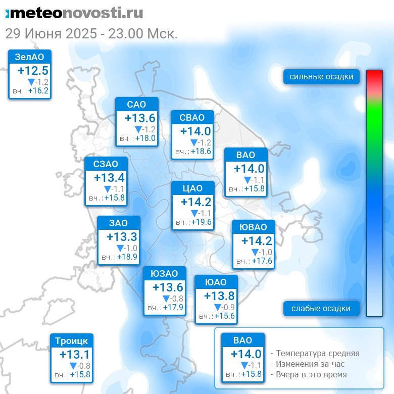 В 23:00 в Москве было от +12°C до +14.4°C, средняя температура +13.6°C #погода #Москва #лето #температура #29июня #воскресенье