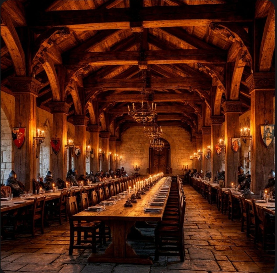 После боя рыцари сопроводили меня с Эммой в столовую их академии. Место оказалось впечатляющим: просторный зал под высокой дубовой крышей, которую поддерживали массивные колонны, украшенные резьбой в виде мечей, щитов и шлемов. По краям крыши висели настоящие боевые щиты — старые, с потёртыми краями, но с гордо сияющими в центре гербами.