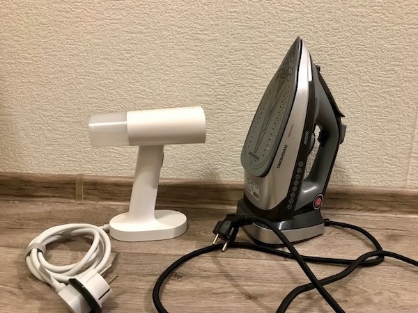 Утюг привязан к доске, что неудобно, если её нет. Отпариватель и парогенератор позволяют работать вертикально: можно отпарить костюм, висящий на плечиках, или шторы на карнизе.