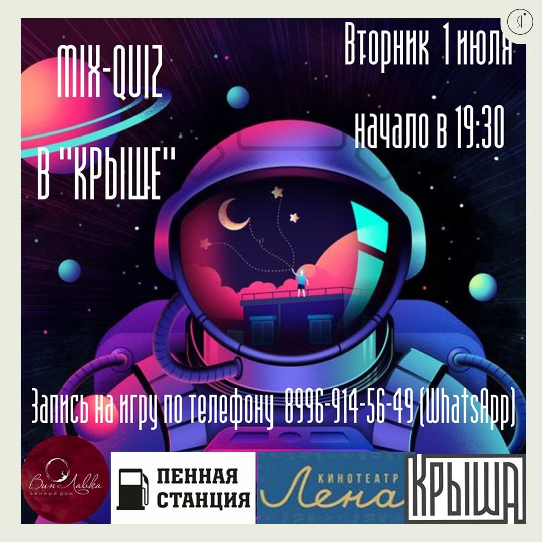 Mix-Quiz #Вечером Любите музыку? Обожаете кино? Знаете ответы на самые неожиданные вопросы? Тогда вам точно к нам! 🤩 Три захватывающих тура и 90 вопросов из разных областей знаний. 🤩 Два часа драйва, азарта и отличного настроения в кругу друзей! 🤩 Призы и подарки ждут победителей Для команд от 2-х человек 1 июля | 19:00 Крыша, Кальвица, 14/1а 500 руб. +79969145649 Online Якутия | Подписаться