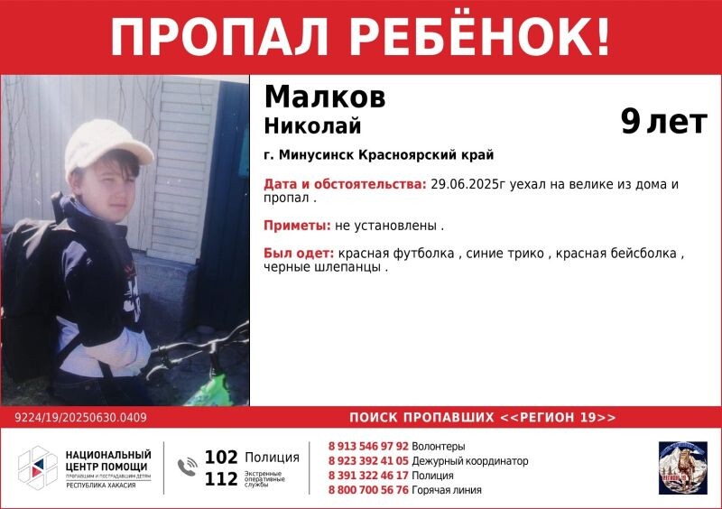❗️В Минусинске пропал 9-летний Николай Малков Накануне мальчик уехал на велосипеде из дома, и до настоящего времени о его местонахождении ничего неизвестно. Был одет: красная футболка, синие трико, красная бескозырка и черные шлепанцы. Всех, кому что-либо известно о местонахождении ребенка, просят позвонить по телефонам: 8 913 546 97 92, волонтеры; 8 923 392 41 05, координатор; 8 391 322 46 17, полиция; 8 800 700 56 76.