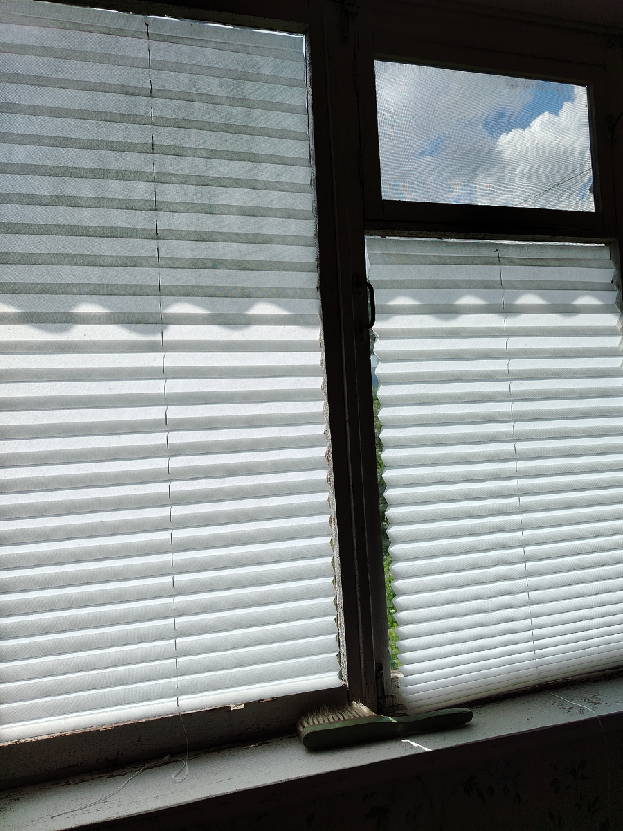 Не доходят руки до штор на даче. Да и денег не хватает. Занавесила окна старыми простынями в одной комнате. В ней два окна. Увидела в магазине вот такие жалюзи, купила две на пробу. 500 рублей вышло. Как раз на одно окно. Пока шторы не сошью. Надо и на второе тоже купить. Мне нравится. Они приклеиваются. Держаться хорошо вроде. Есть шнурок, что бы их собирать. Вот второе окно в комнате. Печаль. К следующей поездке на дачу обязательно куплю и на него жалюзи.