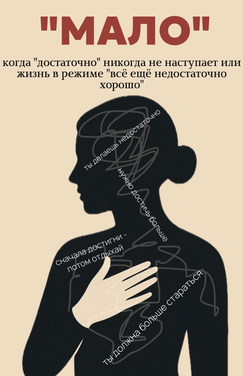 Пока вы живёте в логике «ещё не достаточно», вы всё время отменяете свою жизнь. Вы выносите себя в гипотетическое будущее, где, быть может, вы заслужите право на покой, радость, принятие.
