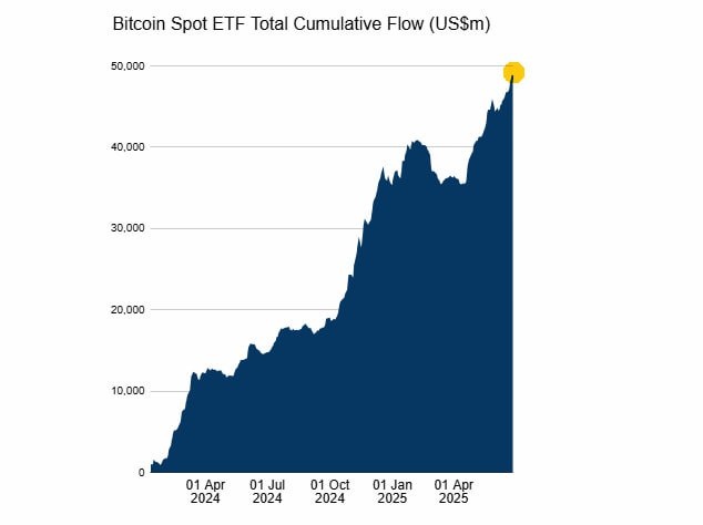 Продолжаются притоки в спотовые #BTC #ETF. Совокупный приток продолжает бить рекорды — данные Farside