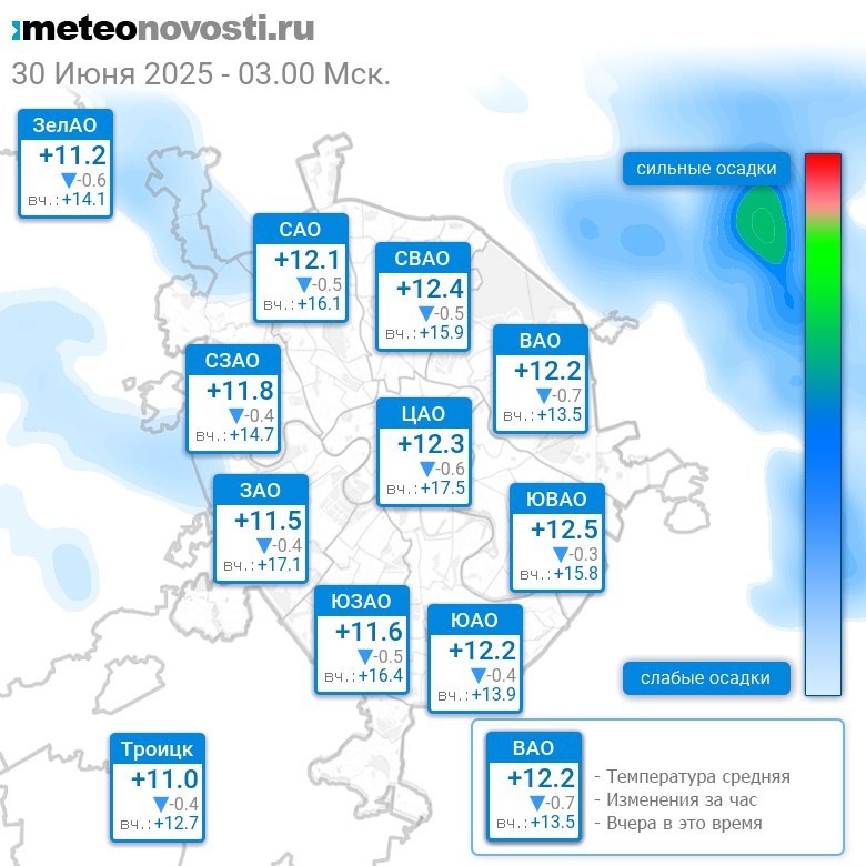 В 3:00 в Москве было от +10.5°C до +12.8°C, средняя температура +11.9°C #погода #Москва #лето #температура #30июня #понедельник