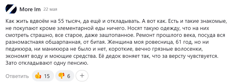 55 тыс. руб. на двоих. Не плохая пенсия на сегодняшний день. Можно прожить, как считаете? Читала комментарии вчера и сегодня. Один подписчик написал: Я знаю пенсионеров, которые и с меньшей пенсией копят деньги на вкладах или под подушкой. Да, на пенсии уже не хочется особых нарядов, обновок. Можно носить старую одежду, которой накопилось за всю жизнь очень много. А почему бы не носить заштопанную одежду? К примеру, у меня носки, джинсы иногда рвутся. Я их зашиваю и ношу пока совсем не порвутся. Главное, чтобы одежда была чистая, наглаженная. Что касается посуды, то у меня на этом тоже нет "пунктика". Сохранилась от родителей старая советская посуда и мы ей до сих пор пользуемся. За всю жизнь купила наверно 3 новые тарелки и 5 кружек. Все остальное - приданое от родителей. Есть даже тарелка с оббитым кусочком. Жаль выбросить. Про ремонт я тут не спорю. Пока еще работают люди, нужно позаботиться о ремонте, чтобы потом на пенсии жить хоть в каком-то комфорте. У нас была раньше кварт