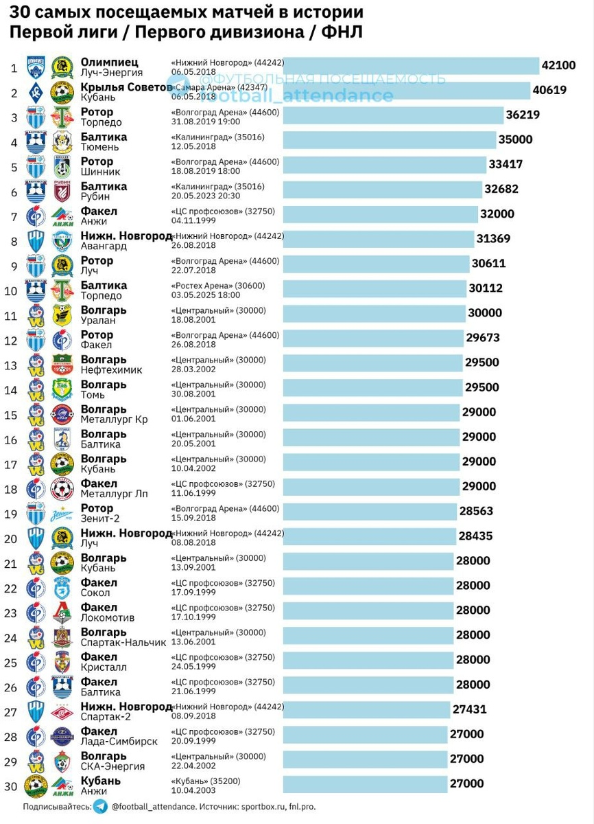 На 7-м месте игра Факела и Анжи из 1999-го (32000) – это лучшее значение из прошлой эпохи и стадионов до ЧМ. И это единственный матч в топ-10 не на арене ЧМ. Сезон 1999 для Факела – 7 матчей из того года в списке. 24814 зр./матч – как вы можете догадаться, в 1999-м больше всего в России на футбол ходили именно в Воронеже. Жаль, что теперь о таких цифрах у Факела, придется только мечтать.