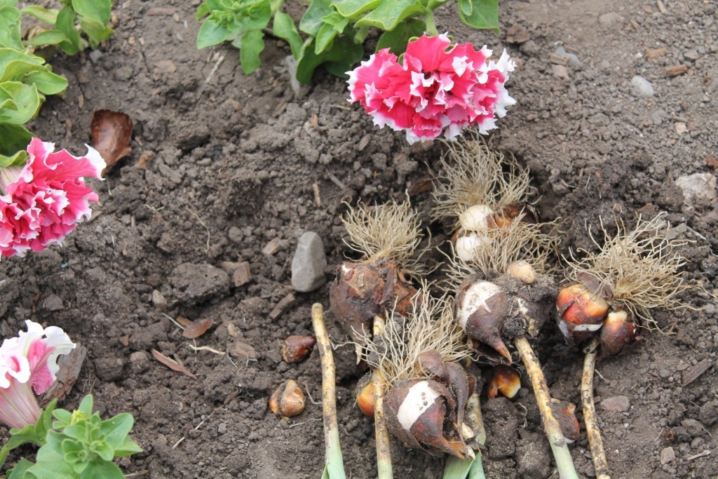 Сигнал к работе — массовое увядание и засыхание большей части стеблей и листвы. Можно для контроля подкопать 1-2 экземпляра и удостовериться, что старые корешки отмерли, новых - еще нет. А луковки обзавелись плотными коричневыми покровными чешуйками. Если упустить время, «вершки» сгинут, и цветы можно не найти.