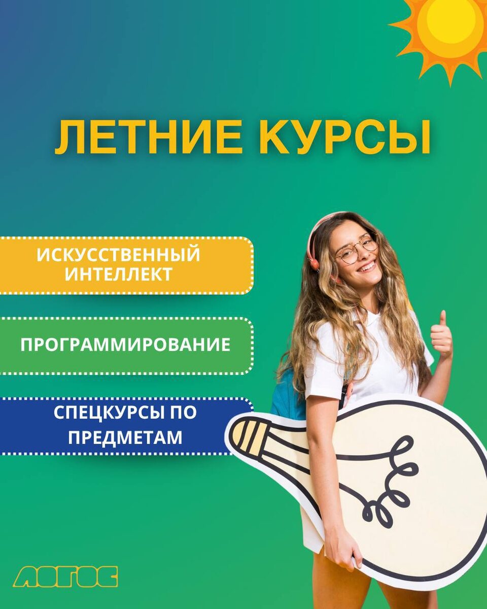 Уважаемые родители! ☀️ Лето — это не только время отдыха, но и отличная возможность узнать новое, подтянуть знания по школьным предметам без нервов и спешки, и подготовиться к новому учебному году. Образовательный центр по подготовке школьников к ОГЭ/ЕГЭ, ВПР «Логос» предлагает краткосрочные летние курсы для школьников 5–11 классов по следующим направлениям: ⁃ Введение в искусственный интеллект; ⁃ Основы программирования; ⁃ Спецкурсы по предметам. ПОДРОБНУЮ ИНФОРМАЦИЮ МОЖНО ПОСМОТРЕТЬ В ТГ канале центра.