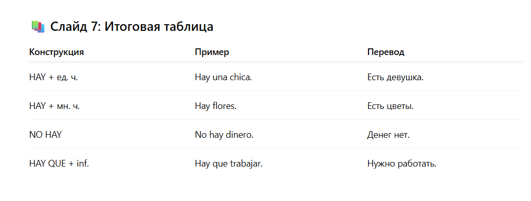 👉Безличная форма HAY — это производная от глагола HABER (в настоящем времени, presente),она безличная означает что мы ее используем без привязки какому-либо лицу. НО, ЕСЛИ ПОСЛЕ HAY СТОИТ СУЩ.МНОЖЕТСВ ЧИСЛЕ ТО МЫ НИЧЕГО НЕ СТАВИМ Когда у нас отрицательная форма, NO HAY то и независимо сущ. во множественном или единственном числе. НИКАКИХ АРТИКЛЕЙ НЕ СТАВИМ. КОНСТРУКЦИЯ HAY QUE + глагол в инфинитивие. Переводится как надо сделать что либо
