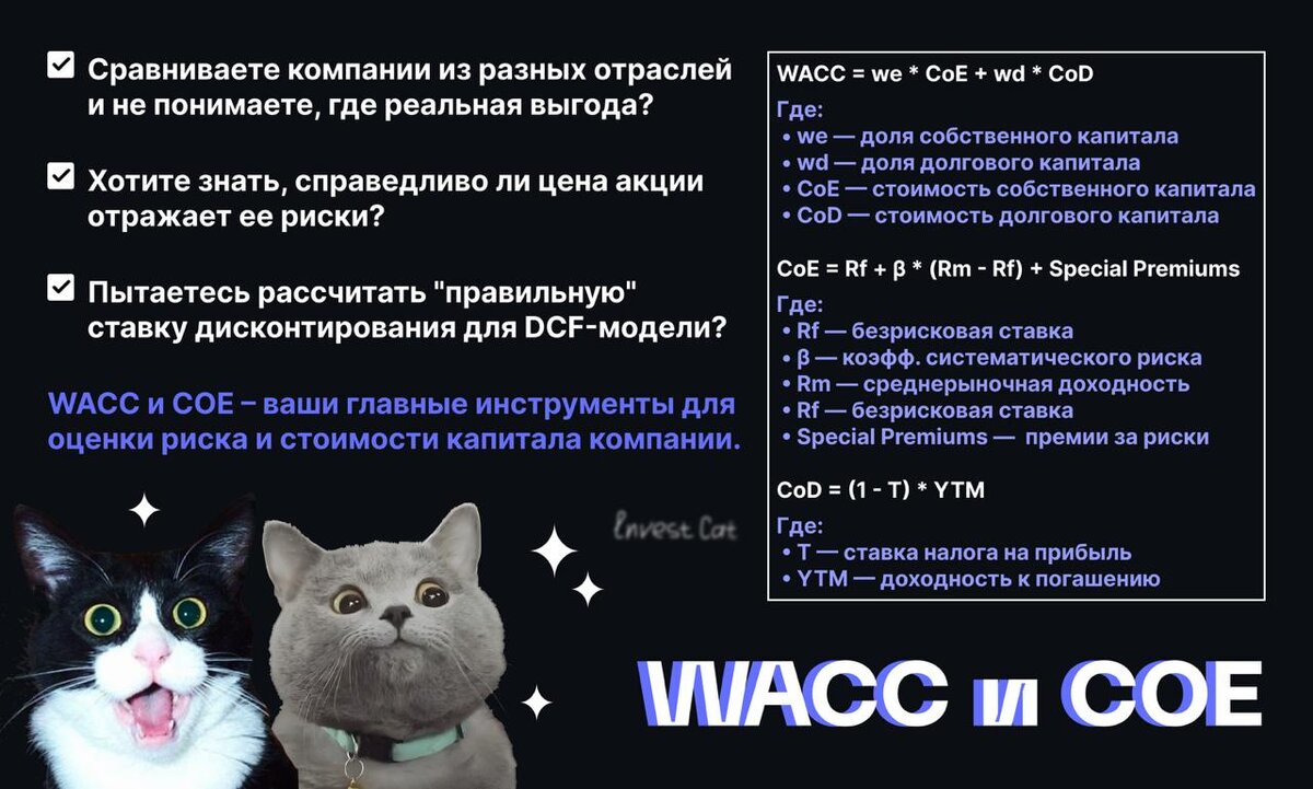 ☄️ WACC и COE: Привет, инвесторы! 👋Выбирая, куда вложить деньги, вы наверняка обращаете внимание на проценты по депозитам или доходность облигаций. Но если вы хотите глубже понимать стоимость капитала компании и оценивать бизнес более профессионально - пора разобраться с такими понятиями, как WACC и COE. 💟 Знакомо чувство, когда: • Сравниваете компании из разных отраслей и не понимаете, где реальная выгода? • Хотите знать, справедливо ли цена акции отражает ее риски? • Тратите часы на попытки рассчитать "правильную" ставку дисконтирования для DCF-модели? ✔️Вот где на помощь приходят WACC и COE – не просто термины из учебника, а ваши главные инструменты для оценки риска и стоимости капитала компании. ℹ️ Что такое WACC и COE, почему они ВАЖНЫ для ВАШЕЙ прибыли? • COE - Минимальная доходность, которую требуют акционеры за риск владения акциями конкретной компании. Чем выше риск (нестабильность рынка, проблемы компании), тем выше должен быть COE, чтобы инвестиция окупилась. • WACC - С