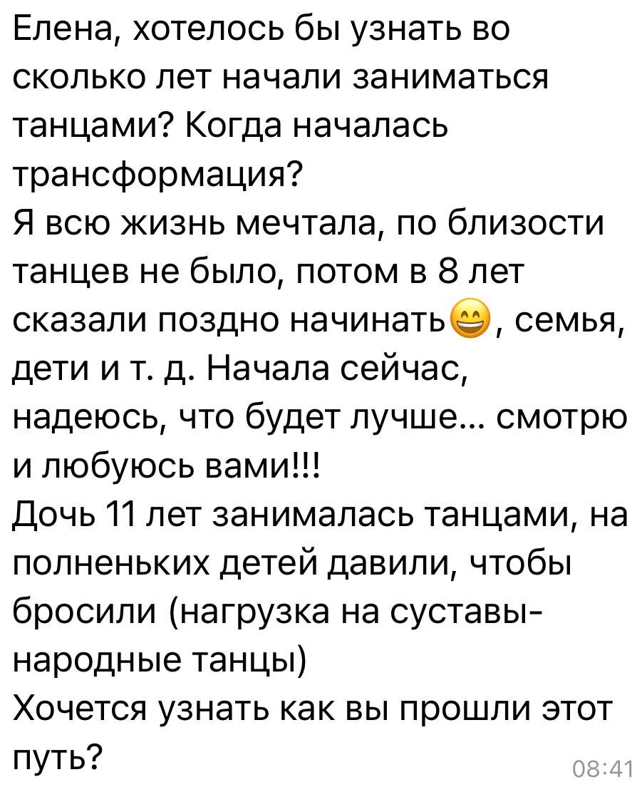 Отвечаю на комментарий : 1. Начала в 24 года . В 27 стала первым профессионалом нижнего Новгорода по Belly Dance по версии ОРТО - общероссийское танцевальная организация и вице чемпионкой России г. Москва 2. Трансформация началась лет с 16 ( тотальное обнуление и потом переходами были фундаментальные шлифовки 😬🫢) 3. В периоде 10-14лет были попытки придти на бальные танцы . Мама хотела что бы я снизила вес. Но на уроках меня не замечали . Ну это понятно . Не тот материал для школы … Я быстро потеряла интерес . В итоге все встало на свои «рельсы» в 24 года ( больно / страшно ) … бросив основную работу и основной источник дохода . начала путь к себе. Без денег 💵 , но довольная как слон ( на бензин то не хватало , одевалась в секонд хендах) Танцевала целыми днями . Это сравнимо с жаждой. Когда очень сильно хочешь пить. Не можешь остановиться. Вот тоже самое было с танцами. Лично я считаю что никогда не поздно найти себя и свое дело в любом возрасте. Но лучше это сделать пораньше.