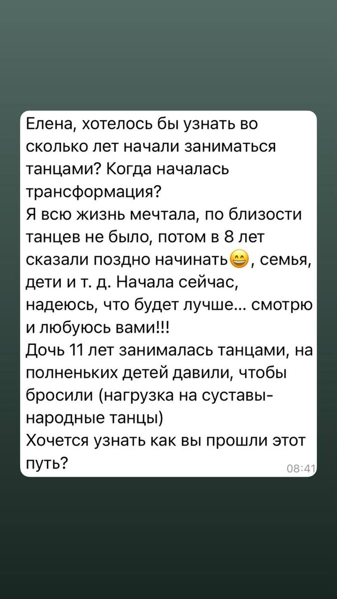 Отвечаю на комментарий : 1. Начала в 24 года . В 27 стала первым профессионалом нижнего Новгорода по Belly Dance по версии ОРТО - общероссийское танцевальная организация и вице чемпионкой России г. Москва 2. Трансформация началась лет с 16 ( тотальное обнуление и потом переходами были фундаментальные шлифовки 😬🫢) 3. В периоде 10-14лет были попытки придти на бальные танцы . Мама хотела что бы я снизила вес. Но на уроках меня не замечали . Ну это понятно . Не тот материал для школы … Я быстро потеряла интерес . В итоге все встало на свои «рельсы» в 24 года ( больно / страшно ) … бросив основную работу и основной источник дохода . начала путь к себе. Без денег 💵 , но довольная как слон ( на бензин то не хватало , одевалась в секонд хендах) Танцевала целыми днями . Это сравнимо с жаждой. Когда очень сильно хочешь пить. Не можешь остановиться. Вот тоже самое было с танцами. Лично я считаю что никогда не поздно найти себя и свое дело в любом возрасте. Но лучше это сделать пораньше.