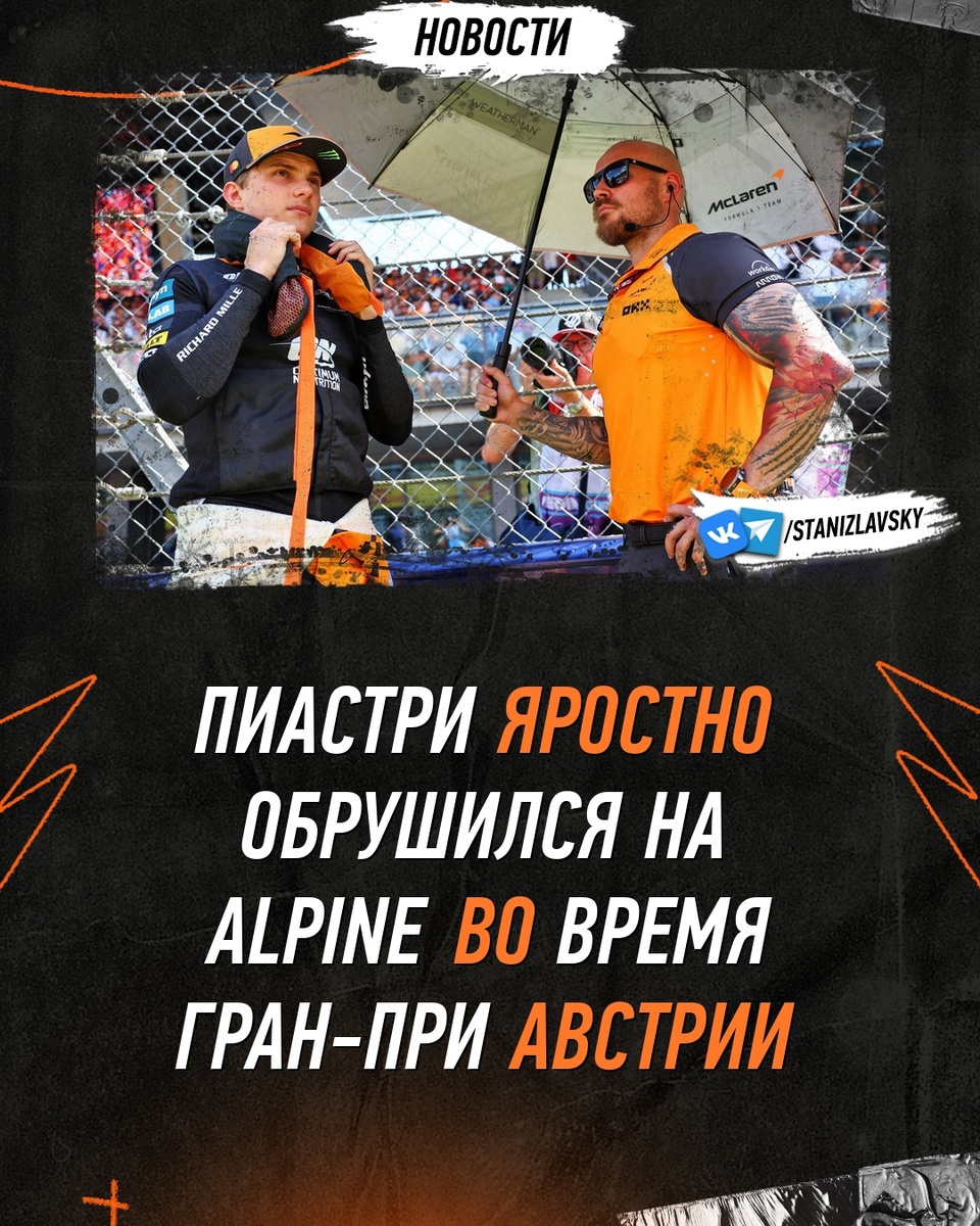 🏎️Оскар Пиастри резко раскритиковал Alpine по радио во время Гран-При Австрии. Австралиец выразил недовольство действиями обоих пилотов Alpine на финальных кругах воскресной гонки на Red Bull Ring, где он занял второе место после партнера по McLaren Ландо Норриса. ⚠️ В погоне за Норрисом, Пиастри обгонял кругового Франко Колапинто, который начал сопротивляться и вытеснил его за пределы трассы. Позже он потерял время и из-за Пьера Гасли, заблокировавшего лидера чемпионата в 1 повороте через два круга после столкновения с Колапинто. 📱Пиастри напомнил о прошлом конфликте с Alpine, сказав по радио: «Alpine всё ещё умудряется найти способ помешать мне даже спустя годы». Это сообщение не транслировалось в прямом эфире, но попало в сеть через запись с онборда. Колапинто заявил, что Пиастри находился в «слепой зоне» во время борьбы с Юки Цунодой, но это не спасло аргентинца от пятисекундного штрафа и двух штрафных очков. После ухода Фернандо Алонсо в Aston Martin Alpine объявила в со