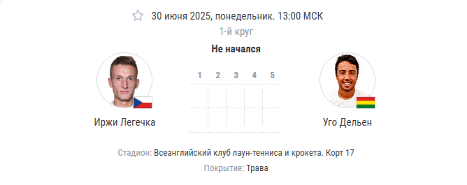 Дельен выиграет сет при спаде концентрации соперника (например, 7:5 в тай-брейке), но проиграет остальные. - Сенсация (победа Дельена): <5% — возможна лишь при травме Легечки или его дисквалификации.