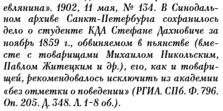"ДАХНОВИЧ Стефан Александрович. Некролог. 13 мая 1902 г. скончался магистр Киевской духовной академии, бывший директор Ченстоховской гимназии, действительный статский советник Стефан Александрович Дахнович на 75 году жизни. Всё время своей отставки, около 25 лет, он прожил в Киеве, принимая деятельное участие в общественной жизни. Не говоря о тех ученых и благотворительных обществах, членом которых он состоял, С. А. был одним из самых энергичных и деятельных членов Киевского отделения епархиального Училищного Совета и долгое время состоял членом-секретарем Николаевского братства при Старо-Киевской Вознесенской церкви. На всех поприщах своей общественной деятельности покойный пользовался общим уважением и любовью. ИР НБУВ. Ф. 175. Д. 1407. Л. 1, вырезка из «Киевлянина». 1902, 11 мая, № 134" [13].