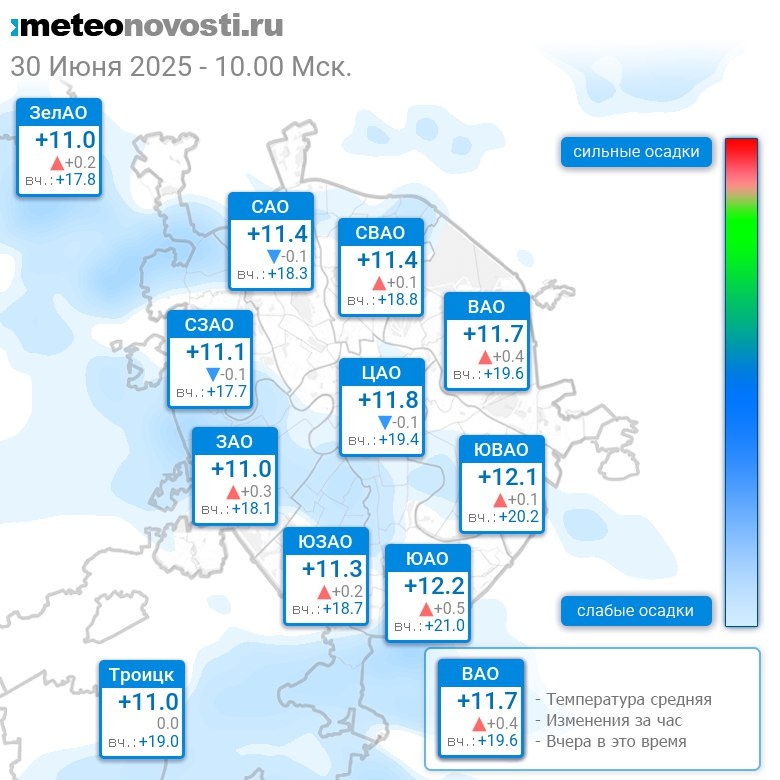 В 10:00 в Москве было от +10.8°C до +12.7°C, средняя температура +11.6°C #погода #Москва #лето #температура #30июня #понедельник