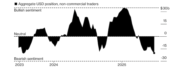Медвежьи ставки на доллар достигли пика с 2023 года. Источник: Bloomberg