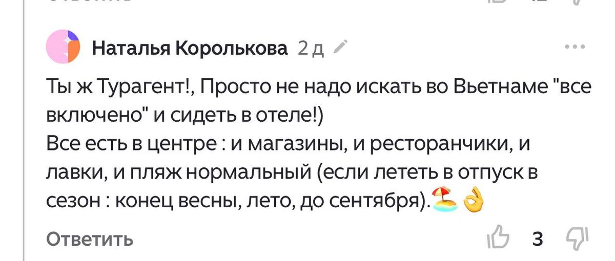 Как угодить всем? У меня на канале есть отдельный раздел с отелями Вьетнама, где есть выбор на любой вкус и кошелек. Но нет, человек прочитал одну статью, даже не удосужившись для начала задать просто корректный вопрос, срузу начинают включать эксперта по курортному отдыху, который «30 лет жил в Нячанге (в своем воображении).