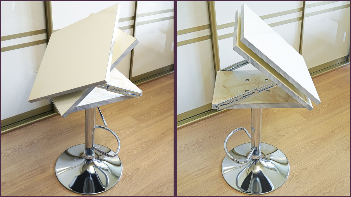 Универсальный столик для рукоделия сделан своими руками по идее, подсказанной одним из авторов каналов на Ютубе. Столик был значительно переработан для придания ему более презентабельного вида и лучшей устойчивости. Универсальный столик для рукоделия получился очень функциональным. Он регулируется по высоте и вращается, поверхность стола поднимается с 0° до 65° с 8 промежуточными положениями. Также отдельно вращается рабочая поверхность столика. Минимальная высота столика 63,5 см, а максимальная - 85 см.
