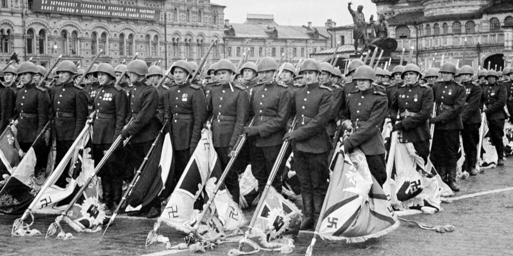24 июня 1945 года в Москве на Красной площади прошел парад в честь победы СССР над Германией в Великой Отечественной войне. Парад войск Красной армии принимал маршал Георгий Жуков, командовал войсками маршал Константин Рокоссовский. В параде приняли участие 35 325 человек: 24 маршала, 249 генералов, 2536 офицеров (от младшего лейтенанта до полковника), 31 116 сержантов и солдат, 1400 военных музыкантов, а также 1850 единиц техники.