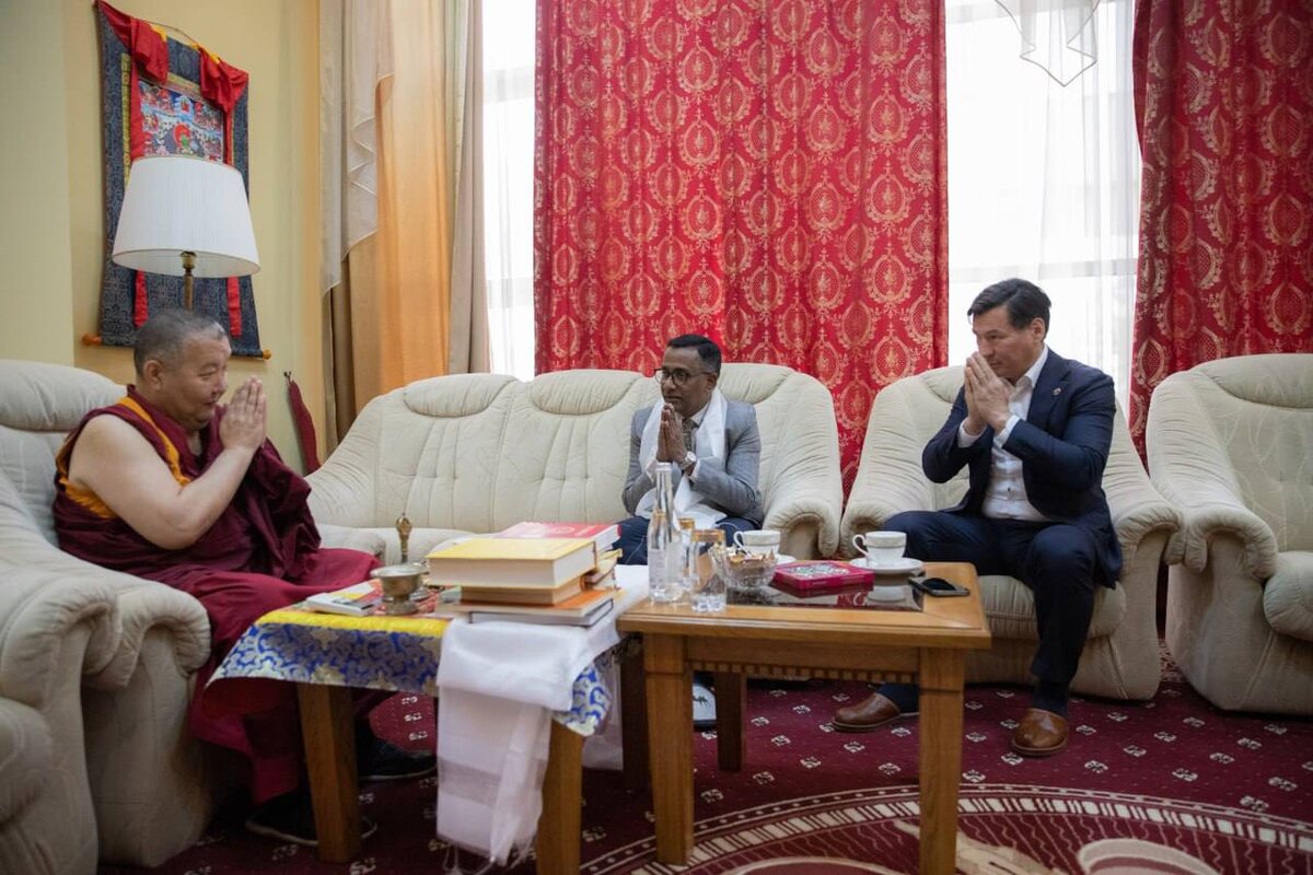 Индийский гость посетил Центральный хурул «Золотая обитель Будды Шакьямуни», где встретился с Шаджин Ламой Калмыкии геше Тензин Чойдаком.