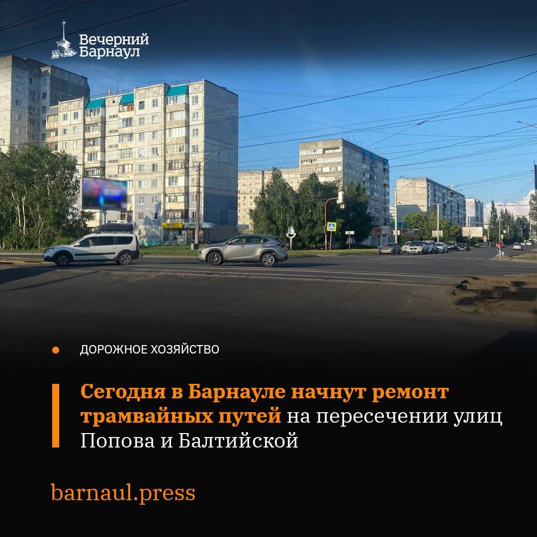 Сегодня в 22:00 на пересечении улиц Попова и Балтийской в Барнауле приступят к ремонту трамвайных путей