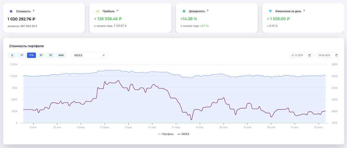 💼Новый уровень контроля над инвестициями — уже в Finrange Наконец-то, по многочисленным просьбам, мы запустили трекер инвестиционного портфеля — удобный инструмент для учёта активов, оценки доходности и анализа структуры портфеля в одном месте. Что вы получаете: - Актуальную стоимость портфеля в режиме - Доходность за день, месяц, год — по всему портфелю - Сравнение с индексами за любой период: лучше или хуже рынка? - Структуру портфеля — в таблице и на диаграмме - Анализ портфеля по годам и месяцам — узнайте свой худший и лучший месяц Finrange превращает таблицы в аналитику, а портфель — в стратегию. Следите за результатами, принимайте взвешенные решения, не теряя времени на рутину. 👉Готовы попробовать? Войдите в аккаунт и начните отслеживать свой портфель уже сегодня - https://finrange.com/ru/portfolio 🗣Сейчас доступ открыт для клиентов Т-Банка через API. Для остальных брокеров скоро появится функция ручного добавления сделок — вы сможете вести портфель вручную и сохранять историю