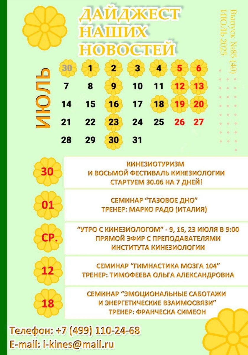 30 июня - Кинезиотуризм и Восьмой Фестиваль кинезиологии 01 июля - Тазовое дно 9; 16; 23, 30 июля - Утро с кинезиологом! 12 июля - Гимнастика мозга 104 18 июля - Эмоциональные саботажи и энергетические взаимосвязи 👉🏻👉🏻 ОТЗЫВЫ О НАШЕЙ РАБОТЕ В ТГ👈🏻👈🏻 👉🏻👉🏻ОТЗЫВЫ О НАШЕЙ РАБОТЕ НА RUTUBE👈🏻👈🏻