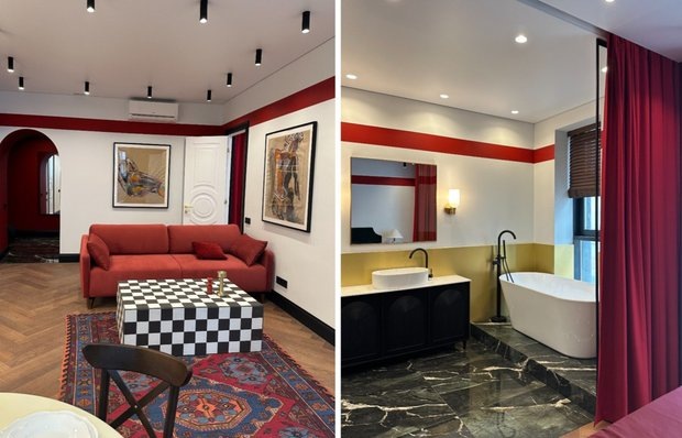 Шторы вместо фасадов, ванна в спальне у окна, фартук из алюкобонда Дизайнер и архитектор Сабина Неровня создала яркий и комфортный интерьер для молодой семьи с ребенком. Она использовала яркие цвета и нестандартные решения в отделке, превратив обычную новостройку в смелый арт-объект. Трехкомнатная квартира находится в московской новостройке недалеко от Павелецкой площади. В ней достаточно пространства для удобной жизни: есть кухня-гостиная, спальня и детская комната. Также предусмотрены гардеробная и прихожая, а два санузла делают повседневный быт более комфортными. На полу в жилых комнатах уложен кварцевый паркет с приятной фактурой дерева. Стены окрашены в белый цвет — он визуально расширяет пространство и придает ему легкость. Малиновый кант по периметру комнат добавляет яркий акцент и задает настроение всему интерьеру. Черные плинтусы перекликаются с черными наличниками межкомнатных дверей, создавая гармоничное сочетание с остальными элементами. Кухня совмещена с гостиной, поэтому