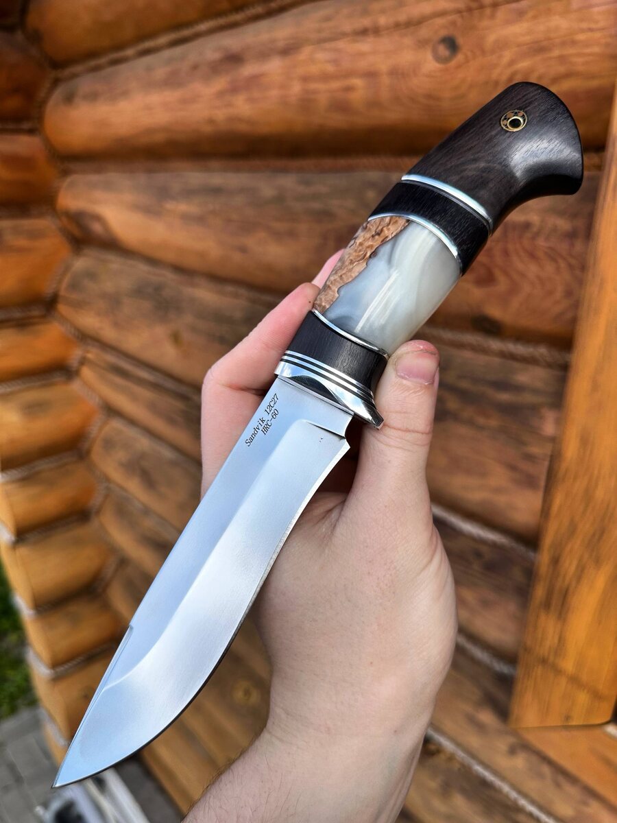 Охотничий нож «Варан» из шведской нержавеющей стали Sandvik 12C12, спуски от середины клинка в маленькую вогнутую линзу, что делает рез агрессивным, бритвенная заточка. Материал рукояти: черный граб, стабилизированная карельская береза коричневая и акрил белый с мозаичным пином. Твердость клинка (HRC): 60 Цена ножа: 10.500 рублей В комплекте идут ножны из натуральной кожи. Можем сделать формованные ножны +6000 рублей. Для заказа писать на @Nazarklinokbot или по тел +79101343831 WhatsApp/Viber