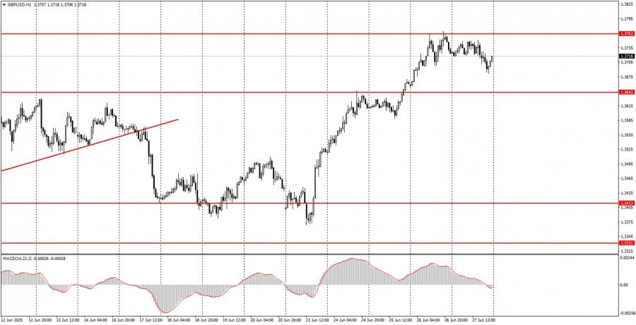 https://basechop.ru/wordpress/?p=48493 Разбор сделок пятницы: 1Н график пары GBP/USD. Пара GBP/USD в пятницу также торговалась достаточно спокойно, но в отличие от пары EUR/USD трейдеры не посчитали нужным отрабатывать макроэкономическую статистику из Великобритании. Впрочем, им явно не особенно нужна сейчас поддержка макроэкономического фона. Фунт только на прошлой неделе вырос на 300 пунктов, а оснований для постоянного падения доллара – хоть отбавляй. Напомним, что на прошлой неделе сначала Дональд Трамп устроил чехарду, достойную компьютерной игры или кинокомедии, с урегулированием конфликта между Ираном и Израилем. Затем стало известно о прекращении огня Иерусалимом и Тегераном. Затем Трамп вновь критиковал ФРС и подыскивал замену Пауэллу. В то же самое время в Банке Англии начали говорить о высокой инфляции и ее возможном устойчивом, длительном характере. А это означает, что в ближайшее время БА ставку снижать не будет. Какой из вышеперечисленных факторов мог хотя бы теоретичес