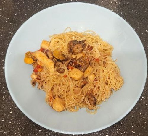 Это я разгребала морозильную камеру и нашла в ней морской коктейль. А так как, уже писала, вчера на меня напала лень и готовить не очень-то хотелось, поэтому вместо домашних сосисок я сделала фунчозу с морепродуктами. Получилось очень вкусно. А главное очень быстро. Итак, переходим к рецепту. Ингредиенты 1 средняя луковица 1 маленький болгарский перец 500 г морского коктейля 3-4 ст.л. соевого соуса соль перец по вкусу 1 зубчик чеснока 1 ст.л. кунжута (для красоты) Морской коктейль предварительно размораживаем в холодильнике. Лук режем тонкими полукольцами, перец режем тоже полукольцами)))) На кунжутном масле"обжариваем" лук и перец, минут 5. Добавляем давленный через чеснокодавку чеснок. Перемешиваем несколько раз, добавляем морской коктейль и готовим все вместе еще минут 5. В это время готовим фунчозу по инструкции на упаковке. Я заливала свою кипятком на 5 минут. Откидываем фунчозу в сито, даем воде стечь и отправляем ее в сковородку к морскому коктейлю. Вливаем соевый соус, перемеши