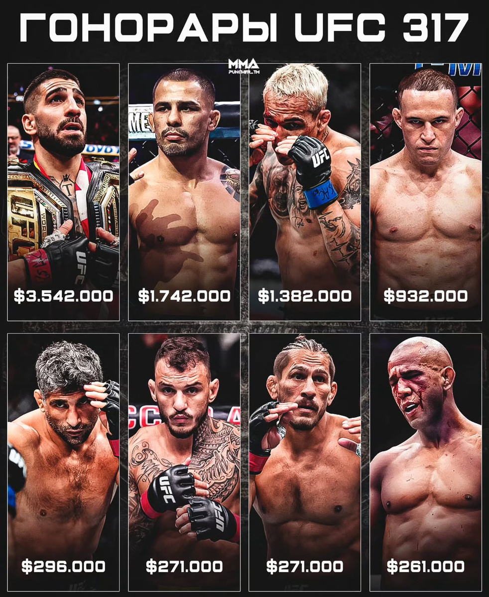 Агентство Sporty Salaries опубликовало информацию о самых крупных гонорарах бойцов на UFC 317 • рейтинг возглавил Илия Топурия со своим внушительным гонораром - более чем 3,5 миллиона долларов. • недавний соперник Илии - Чарльз Оливейра, в свою очередь может похвастаться не столь значимой суммой - 1,4 миллиона долларов. 😄не тем мы занимаемся