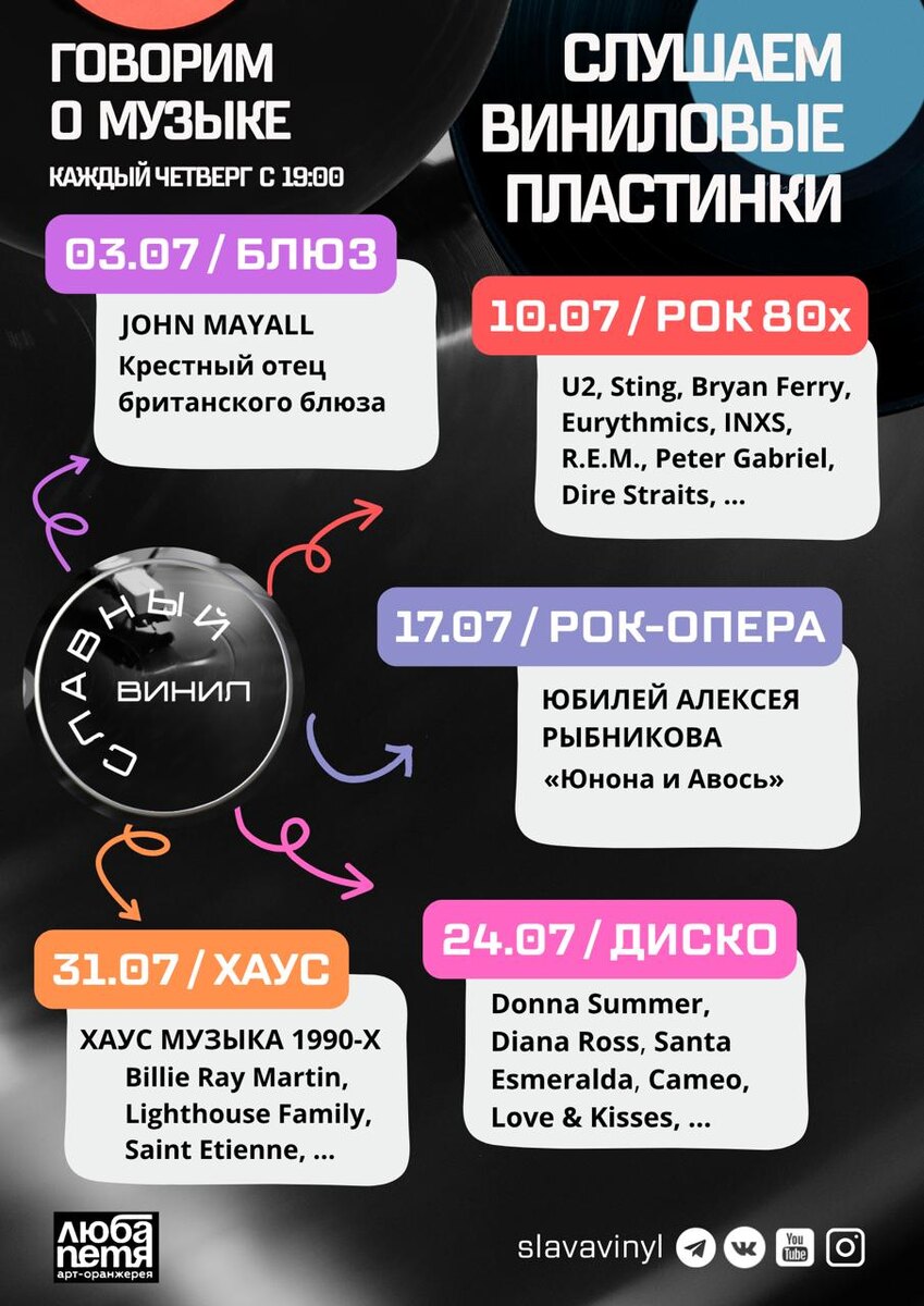 🎶 Клуб любителей винила. ИЮЛЬ 2025 Каждый четверг собираемся в арт-оранжерее «ЛюбаПетя», чтобы слушать винил, обсуждать музыку и узнавать больше о жанрах и исполнителях, которые вдохновляют нас вот уже не одно десятилетие. 📅 3 июля — БЛЮЗ John Mayall — крёстный отец британского блюза. Его группа была своеобразным трамплином для многих талантливых музыкантов, которые впоследствии стали звездами блюз-рока и рок-музыки. Именно он открыл миру Эрика Клэптона, Мика Флитвуда, Питера Грина, Джона МакВи, Джека Брюса, Мика Тейлора, Эйнсли Данбара и других. 📅 10 июля — РОК 80-х Слушаем и говорим о U2, Sting, Bryan Ferry, Eurythmics, INXS, R.E.M., Peter Gabriel, Dire Straits и других. 📅 17 июля — РОК-ОПЕРА. К 80-летию Алексея Рыбникова «Юнона и Авось» — музыкальное произведение, ставшее культурным символом. Разбираем историю создания, слушаем записи с пластинки 1981 года. 📅 24 июля — ДИСКО Donna Summer — королева диско, Diana Ross — дивная эра после The Supremes, Santa Esmeralda и испанс