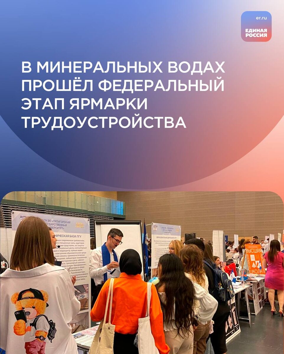 В Минеральных Водах прошёл федеральный этап Всероссийской ярмарки трудоустройства «Работа России. Время возможностей». Мероприятие состоялось под эгидой партпроекта «Моя карьера с Единой Россией». В нём приняли участие первый заместитель руководителя регионального исполкома «Единой России» Наталья Гутовская и председатель общественного совета проекта «Моя карьера с Единой Россией» в Ставропольском крае, директор ГКУ СЗН СК «Краевой кадровый центр» Виктория Полюбина. В ярмарке трудоустройства приняли участие более 3500 посетителей и около 300 работодателей. В ходе мероприятия было представлено свыше 16 500 актуальных вакансий. Участников ждали: живое общение с представителями компаний, карьерные консультации и экспресс-собеседования, мастер-классы по трудоустройству, обсуждение актуальных профессий и карьерных треков, помощь в профориентации для молодёжи и студентов, площадки с участием крупнейших предприятий региона.