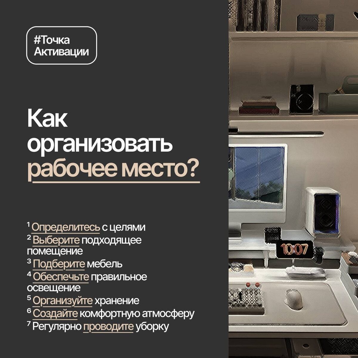 🔥 Точка активации Организация рабочего места — важный аспект продуктивности и комфорта. Мы собрали для вас несколько рекомендаций как организовать своё рабочее место. 🧑💻 Шаг 1: Определитесь с целями ✅ Определите, для какой именно деятельности вам необходимо рабочее место. Это может быть офисная работа, учеба, творчество или хобби. От цели зависит выбор мебели, оборудования и аксессуаров. Шаг 2: Выберите подходящее помещение 🏠 Рабочее место должно находиться в тихом месте с хорошим освещением. Если вы работаете дома, выберите комнату или угол комнаты, где вас никто не будет отвлекать. Идеально подойдет комната с окном, обеспечивающим естественный свет. Шаг 3: Подберите мебель 🪑 Кресло и стол должны соответствовать вашему росту и весу. Кресло лучше выбрать эргономичное, регулируемое по высоте и углу наклона спинки. Стол должен быть достаточно большим, чтобы разместить компьютер, клавиатуру, мышь и дополнительные принадлежности. Шаг 4: Обеспечьте правильное освещение 💡 Использ