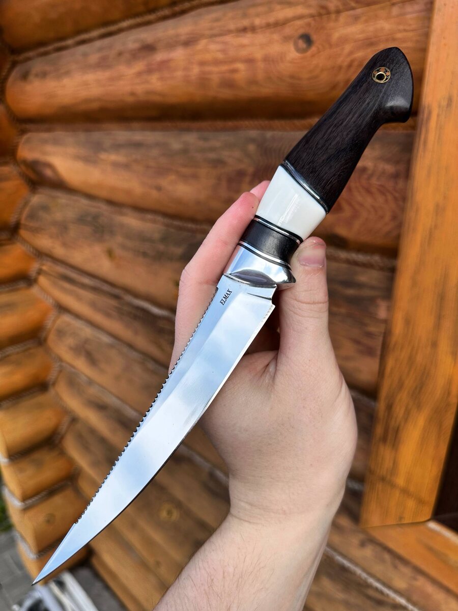 Готов нож «Щука» из лучшей нержавеющей стали Elmax с крио. Сталь прочная на излом, долго держит заточку и агрессивный рез. Спуски идут от середины клинка, что делает нож более прочным при боковых нагрузках. Серрейтер на обухе ножа для быстрого снятоя чешуи у рыбы. Рукоять выполнена из черного граба и акрила белого и мозаичный пин. Нож отлично подойдет для рыбалки и в качестве подарка рыбаку. Нож заточен в бритву. Твердость клинка (HRC): 62 Цена за нож: 22.030 рублей, со скидкой: 16.522 рублей. В комплекте идут ножны из натуральной кожи. Можем сделать формованные ножны +8000 рублей. Для заказа писать на @Nazarklinokbot или по тел +79101343831 WhatsApp/Viber