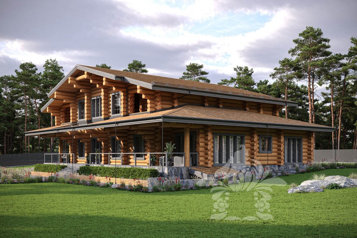 В текущем проекте тоже проработанные уличные площадки, примыкающие к срубу и добавляющие интересные черты внешнему виду дома. Терраса протяженностью вдоль всего главного фасада с собственной крышей. И вторая опоясывающая терраса г-образной формы со стороны подъездной дороги. Главный фасад здания, как это полагается в загородной резиденции, сориентирован на придомовую территорию.