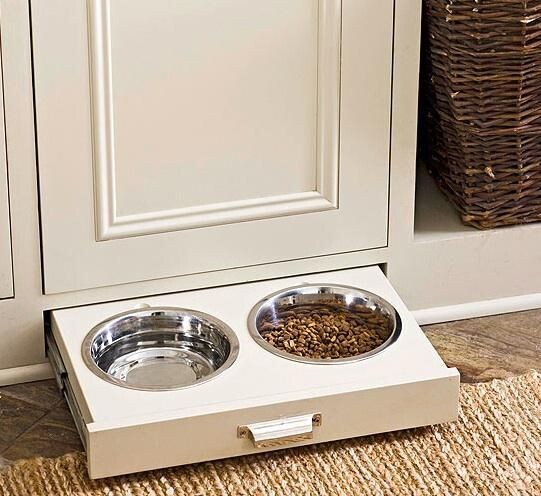 В разных подборках можно встретить такую идею – выдвижной цоколь, в котором установлены миски с кормом и водой для кошек и собак. В реальности это очень плохая идея, и реализовывать ее не стоит. Почему? Первая причина – животным, особенно на сухом корме, всегда нужен доступ к воде. Поэтому такая «подставка для мисок» должна быть всегда выдвинута, не очень-то это комфортно. Вторая причина – вода имеет свойство проливаться, а любые листовые материалы для корпусной мебели плохо переносят длительный контакт с водой. Довольно быстро полка разбухнет, и придется менять ее на новую или отказаться от этого неудачного решения. Минус несколько тысяч, которые были зря потрачены на проектирование и монтаж полки.