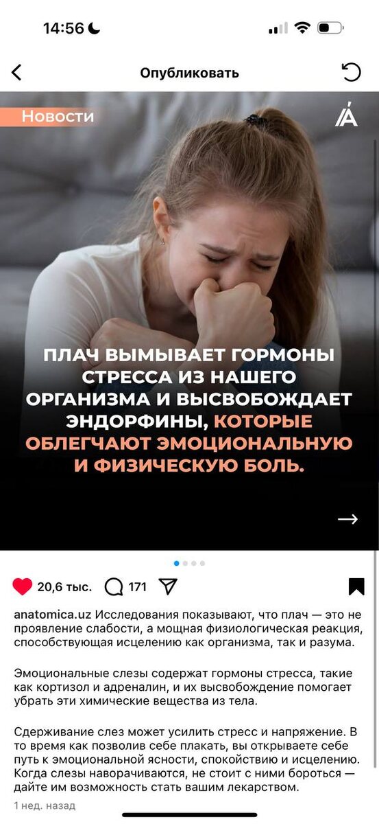Что происходит в организме когда мы плачем Многим кажется что плакать - значит быть слабым. Но, современная психофизиология говорит что с помощью слез мы регулируем эмоции и запускаем процесс исцеления изнутри. Зачем человеку слезы? Каждый из нас хотя бы раз в жизни плакал навзрыд, когда слезы просто текли и текли по щекам и с каждой слезинкой становилось легче. Слезы – это не просто соленая вода, они появляются под влиянием эмоций которые мы переживаем, именно они вызывают глубинный физический отклик. В нас заложен защиты от избыточного разрушающего напряжения. Слезы – способ справляться со стрессом, печалью, сильными эмоциями. Когда мы даем выход слезам, тем самым в организме восстанавливается гармония, на душе становится легче, улучшается настроение, мы снова видим новые возможности. Но есть еще более глубокие изменения – очищающие слезы помогают восстановить гормональный фон. Внутренние изменения во время плача Когда мы плачем наша внутренняя лаборатория активно вырабатывает
