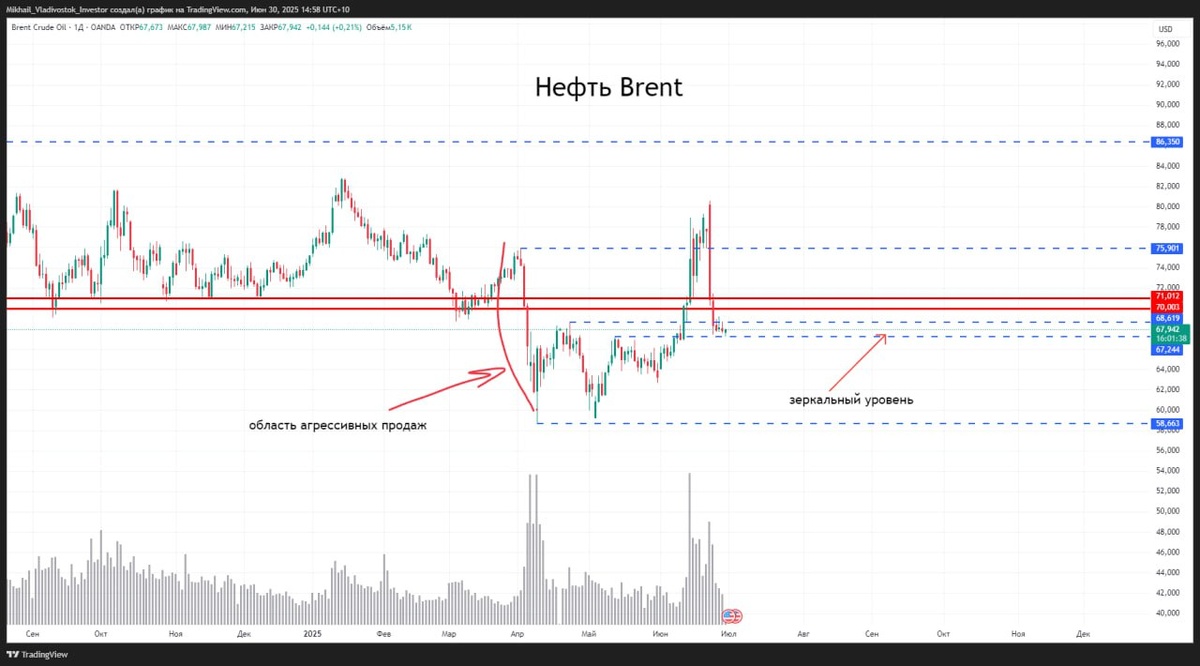 НЕФТЬ Brent $BRN5 Таймфрейм дневной Иран и Израиль прекратили огонь. На этом фоне котировки сильно упали. Дальше всё будет зависеть от напряженности на ближнем востоке. По технике. Так и не смогли закрепиться выше 75,9. Завалили цену на зеркальный уровень 67,24-68,61. Если не будет спроса покупателя, то большая вероятность спуска ниже. ПРИРОДНЫЙ ГАЗ Natural Gas $NGN5 Таймфрейм дневной Глобально газ в боковике. Сложно расторговывается, так как за покупками приходят очень резкие продажи. Если и рассматривать спекуляции, то только на младшем таймфрейме внутри дня. Я бы вообще пока в него не лез. Риски ни к чему. Вынесет в обе стороны. #нефть #газ 🌐 VK | 🤴 YouTube | 😎 Ответы на вопросы | 😎 Курилка-флудилка | 🪙 Канал по крипте